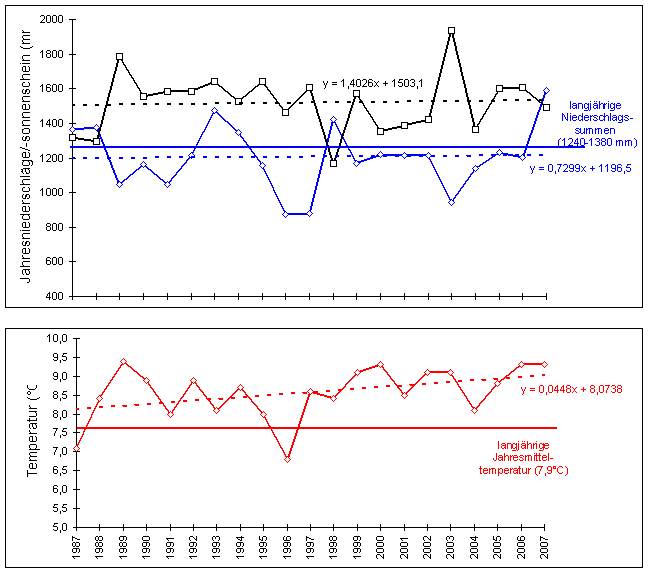 Besonders die Jahresmitteltemperatur liegt über dem langjährigen Mittel und steigt kontinuierlich an. Die Niederschlagsmengen liegen hingegen unterhalb des langjährigen Mittelwerts.
