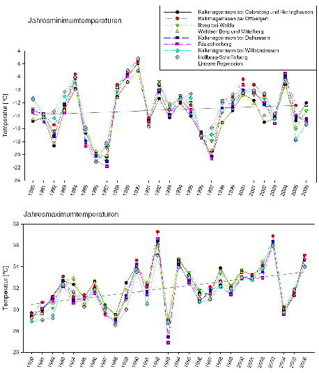 Auch im Weserbergland lassen sich bei zahlreichen Parametern eine unterschiedliche zeitliche Entwicklung innerhalb der letzten 25 Jahre feststellen. So zeigen sowohl die Jahresminimum- als auch die weniger schwankenden Jahresmaximumtemperaturen einen deutlichen Erwärmungstrend an.