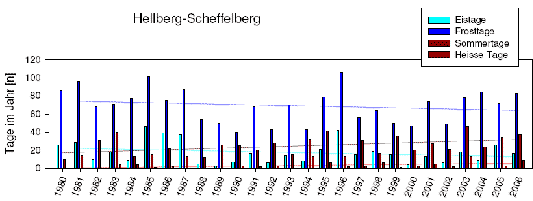 Jahres-Kenntage im Projektgebiet Hellberg-Scheffelberg. Die Anzahl der „Eistage“ (Tmax <= 0°C) und „Frosttage“ (Tmin <= 0°C) nimmt tendenziell ab, während die Anzahl der „Sommertage“ (Tmax > 25°C) und „Heißen Tage“ (Tmax > 30°C) tendenziell zunimmt.
