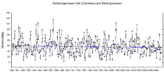 Monatliche Niederschläge im Gebiet der Kalkmagerrasen bei Calenberg und Herlinghausen (Weserbergland). Eine Tendenz abnehmender Niederschläge ist sichtbar.