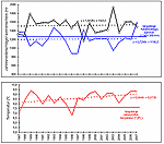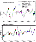 Temperaturentwicklung in den Projektgebieten des Weserberglands im Zeitraum 1980 - 2006. Oben: Minimumtemperaturen, Unten: Maximumtemperaturen.