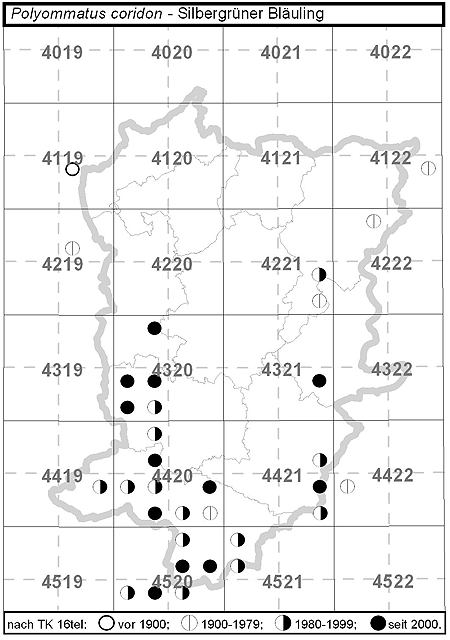 - Polyommatus coridon – scheint von den prognostizierten Klimaänderungen zu profitieren, kann dies aufgrund der engen Bindung an seine Raupenfutterpflanze aber nicht in Arealgewinne ummünzen.