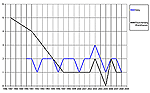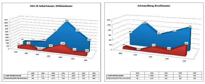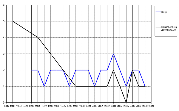 Entwicklung der Bestände von Erynnis tages in den NSG „Iberg“ und „Räuschenberg“. Während am Iberg keine wesentlichen Änderungen erkennbar werden, nehmen die Bestände am Räuschenberg in den 90er Jahren stark ab. Seit dieser Zeit werden umfangreiche Entbuschungsmaßnahmen durchgeführt und die Beweidung wurde wieder aufgenommen.