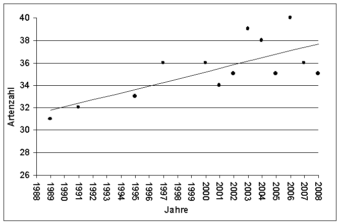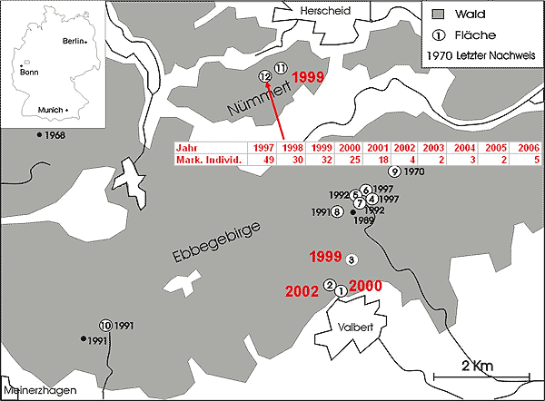 Seit 1989 hat sich die Zahl der im UG Sauerland nachgewiesenen Tagfalterarten von 31 kontinuierlich auf max. 40 (2006) erhöht (Brunzel et al. 2008).