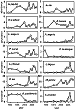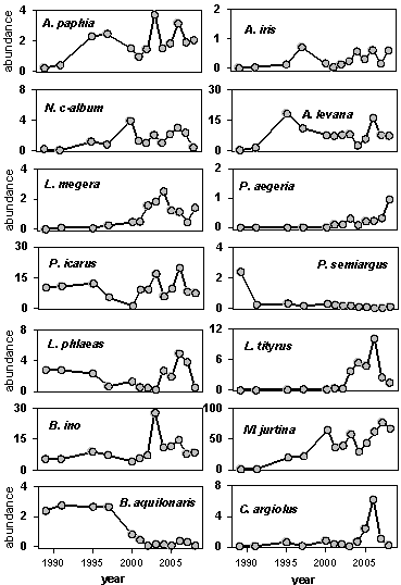 Entwicklung der Abundanz (Individuen / 200 m Transektlänge) ausgewählter Tagfalterarten im Sauerland (Märkischer Kreis) im Zeitraum 1989 – 2008 (aus Brunzel & Brandl, in prep.).