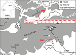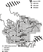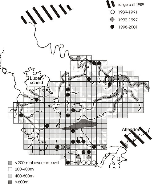 Besiedlung des Ebbegebirges (Märkischer Kreis) durch den wärmeliebenden Blutbär (Tyria jacobeae) im Zeitraum 1989 – 2002 (aus Brunzel et al. 2004).
